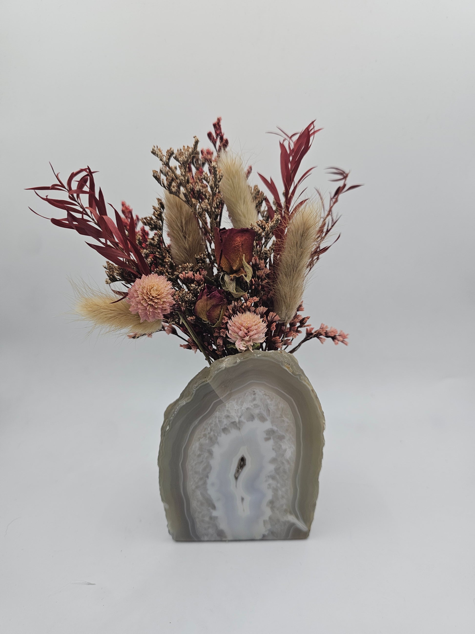 Bring a touch of earthy elegance into your space with this stunning Agate Crystal Floral Arrangement. Each piece features a natural agate candle holder—rich in grounding, calming energy—paired with a hand-selected mix of dried blooms and grasses for the perfect boho–lux finish.