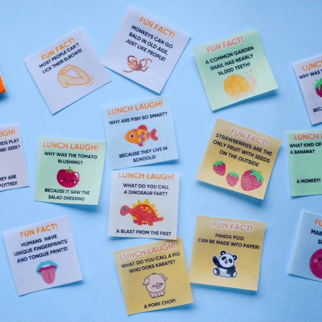 Packet contains 14 lunchbox sized edible notes, made up of fun facts and jokes. They're cute, they're funny, they're educational and they're fun to eat.