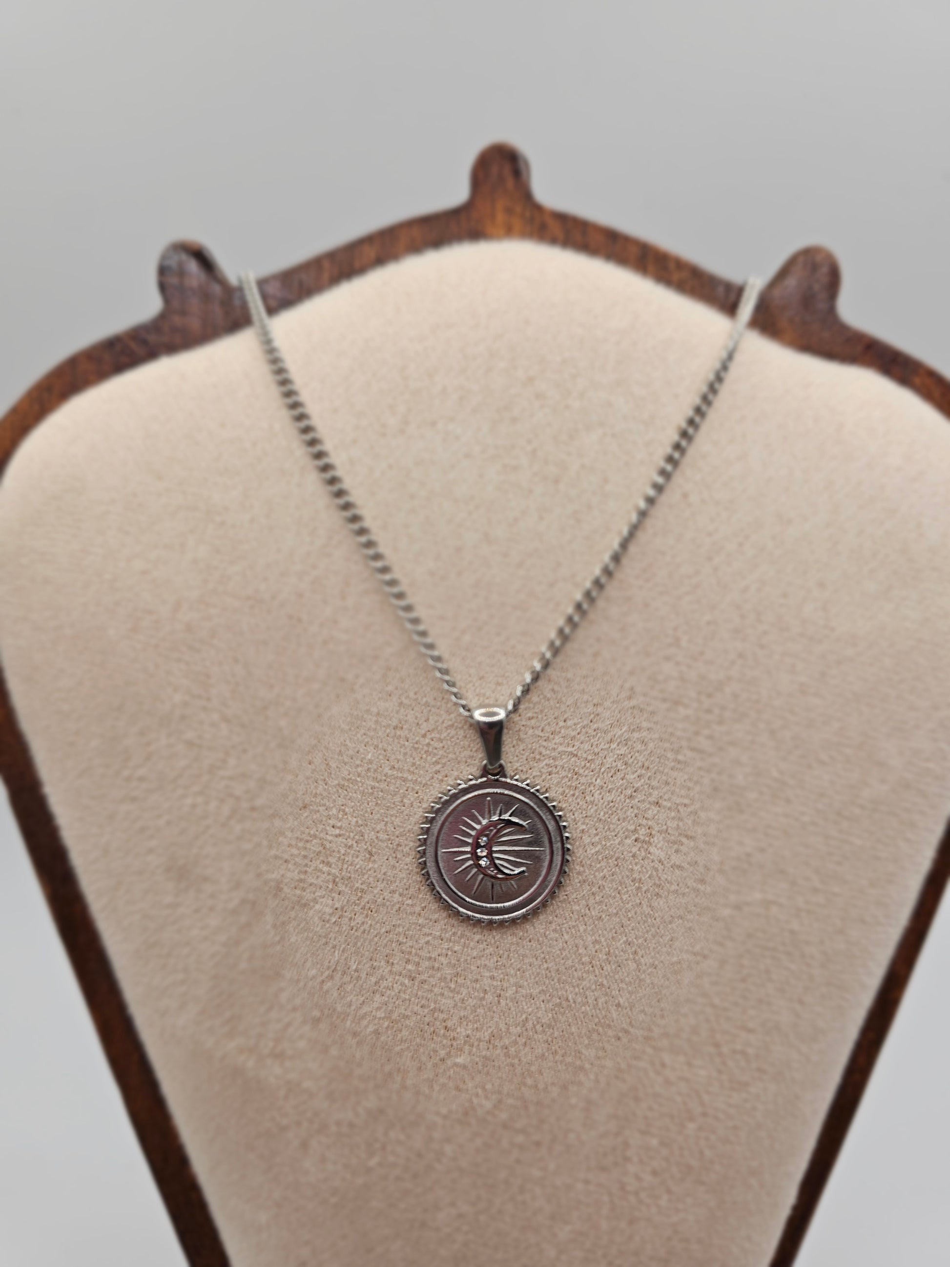 The round pendant features a radiant sun surrounding a crescent moon, adorned with delicate crystal accents—symbolizing harmony, guidance, and inner light. Its sleek silver finish gives it a modern yet mystical touch, perfect for layering or wearing as a statement piece.